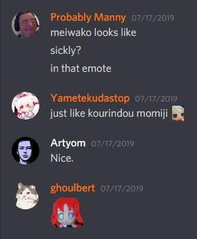 A Meiwako emote was added shortly & then Manny chimed in later saying that it looked a little pale, and so another new emote was made. Sick Meiwako and Healthy Meiwako (with a slightly better complexion)